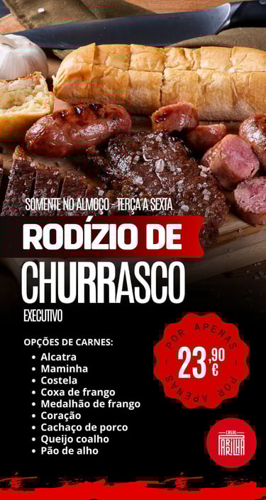 Rodízio EXECUTIVO DE TERÇA A quinta, exceto feriados, por € 23,90 por pessoa. 👉 Reserve já!