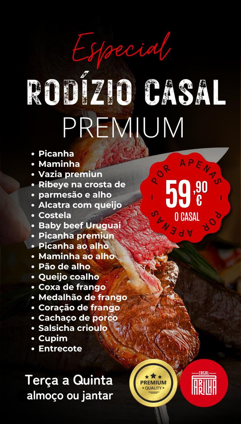 Rodízio EXECUTIVO DE TERÇA A quinta, exceto feriados, por € 23,90 por pessoa. 👉 Reserve já!